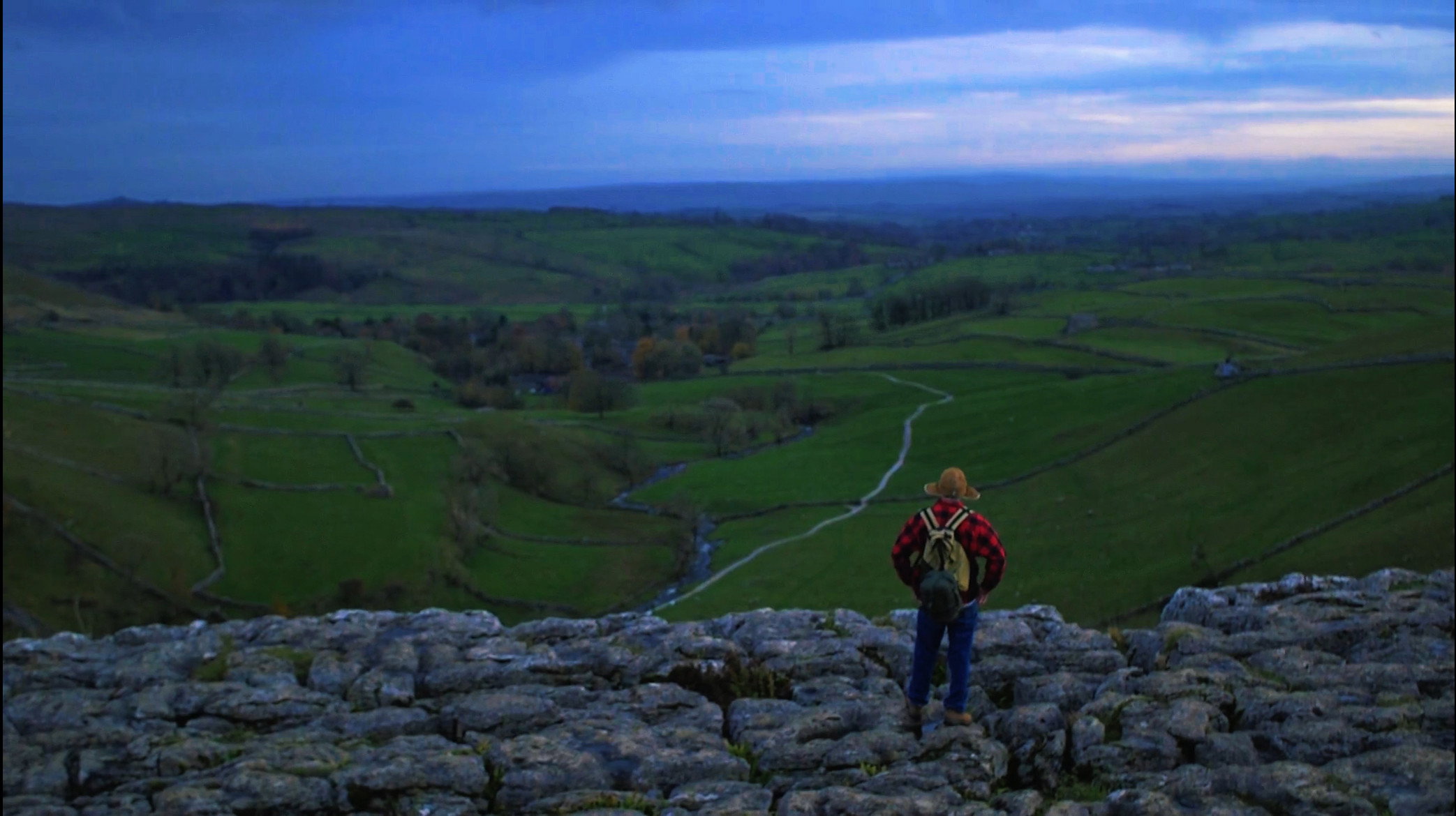 A lonesome wanderer hikes for the day amongst a mass terrain of beautiful and hilly scenery, as night approaches, when the wanderer runs out of water, a man directs him to a waterfall. When night falls, out of the dark, the same man appears at his camp.